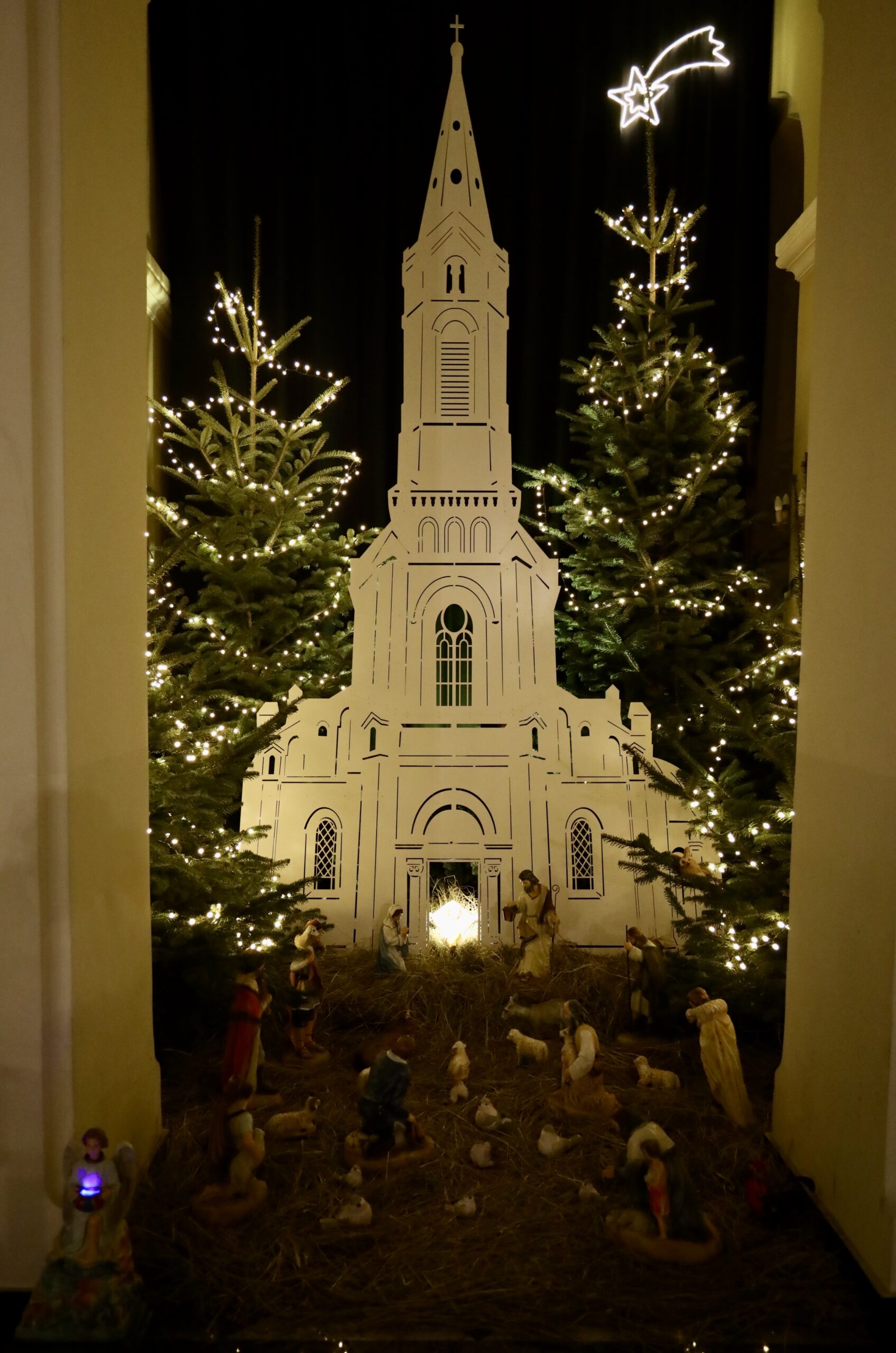 Konstrukcja modelu kościoła została wykonana z precyzyjnie wyciętych elementów, a otoczenie ozdobiono choinkami i figurami biblijnymi, które oddają atmosferę Bożego Narodzenia.