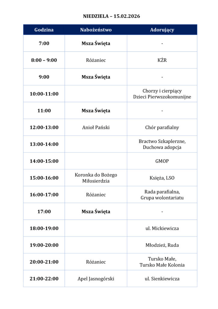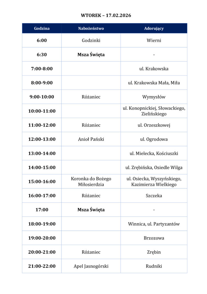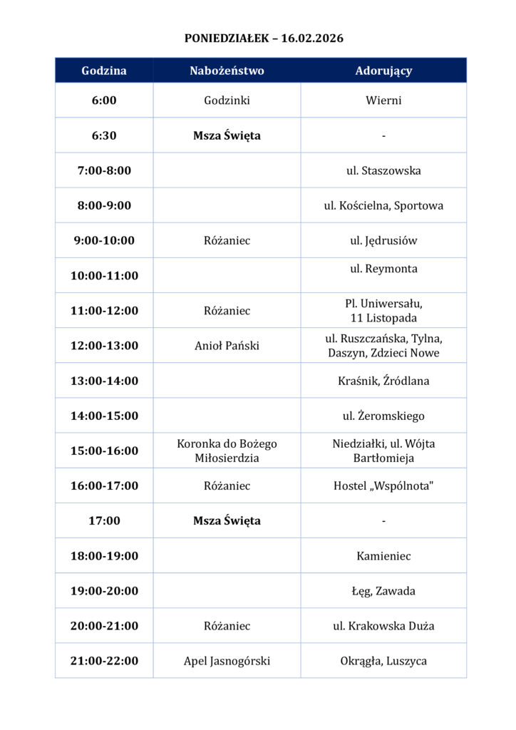 Szczegółowy harmonogram adoracji dla poszczególnych miejscowości i ulic jest dostępny na stronie internetowej parafii, na Facebooku oraz w gablocie przed kościołem.