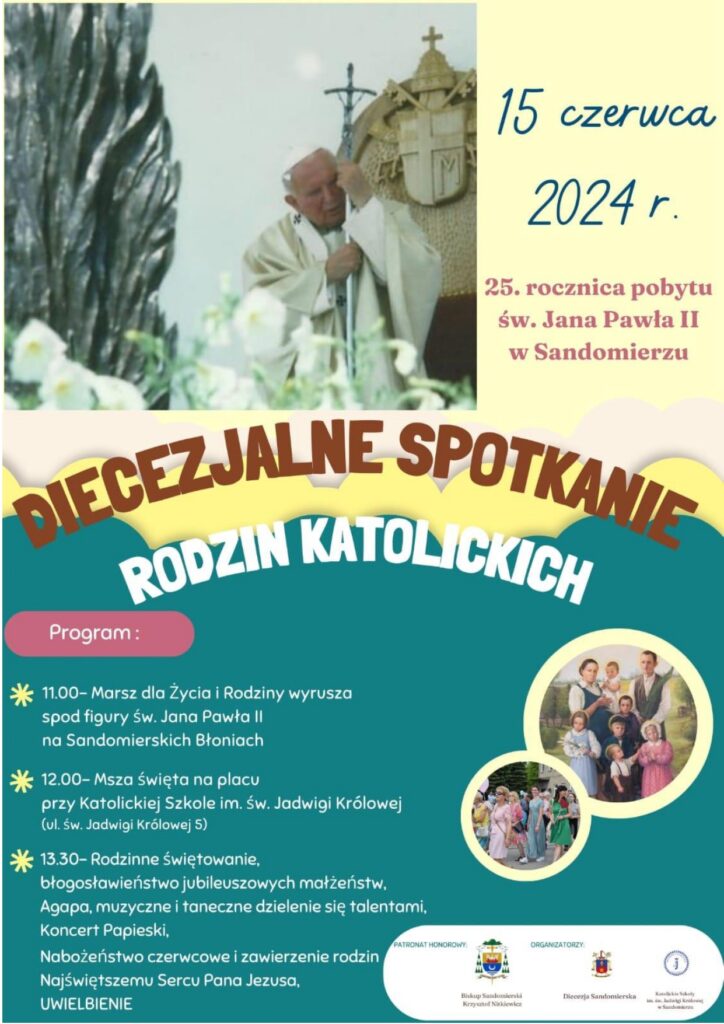 4. W sobotę 15 czerwca w Sandomierzu w ramach trwającego Roku Rodziny oraz 25. rocznicy pobytu św. Jana Pawła II odbędzie się Diecezjalne Spotkanie Rodzin. Początek o godz. 11.00 na Placu Papieskim, skąd wyruszy Marsz dla Życia i Rodziny, następnie przemarsz pod Szkoły Katolickie im. św. Jadwigi Królowej, gdzie o godz. 12.00 sprawowana będzie Msza św. Szczegóły na stronach internetowych. Zachęcamy do udziału w tym spotkaniu.