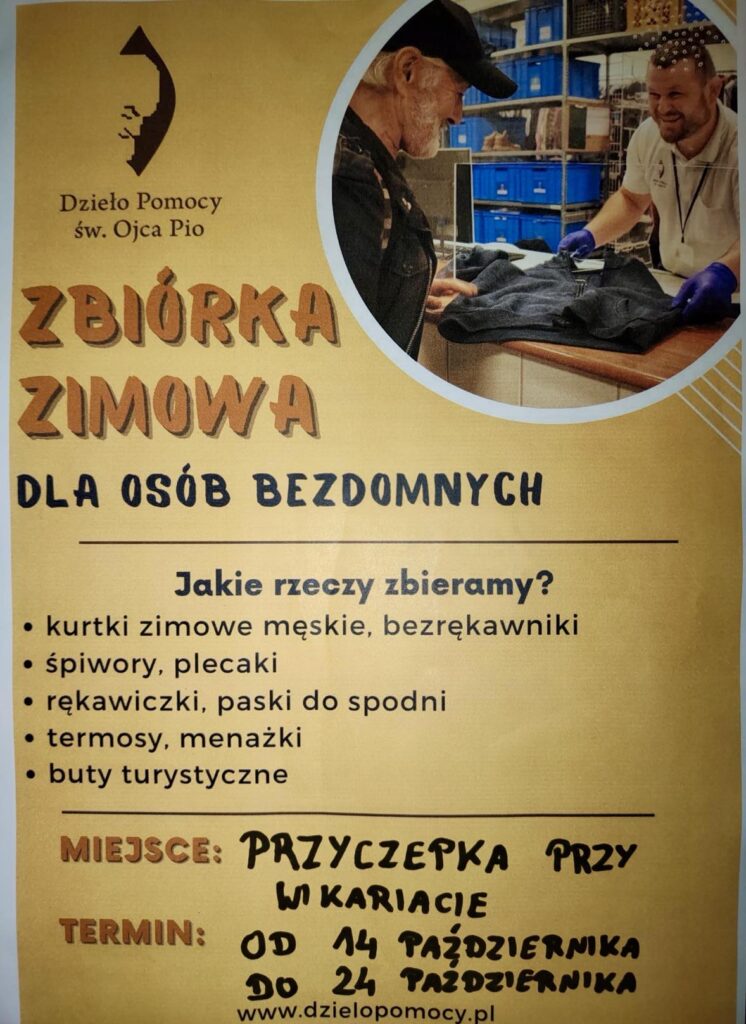 10. Grupy Modlitwy św. Ojca Pio z naszej diecezji organizują zimową zbiórkę darów rzeczowych dla osób bezdomnych, będących podopiecznymi krakowskiego Dzieła Pomocy św. Ojca Pio. Najbardziej potrzebujemy rzeczy, takich jak: kurtki zimowe męskie, bezrękawniki, śpiwory, plecaki, rękawiczki, paski do spodni, termosy, menażki, wygodne obuwie sportowe, zimowe lub letnie, bluzy dresowe, polary, spodnie jeans, dresowe. Czyste rzeczy spakowane do worków, będzie można podobnie jak na wiosnę włożyć do przyczepki stojącej przy wikariacie. Zbiórka potrwa od niedzieli 14 października do czwartku 24 października. Patrz plakat poniżej.